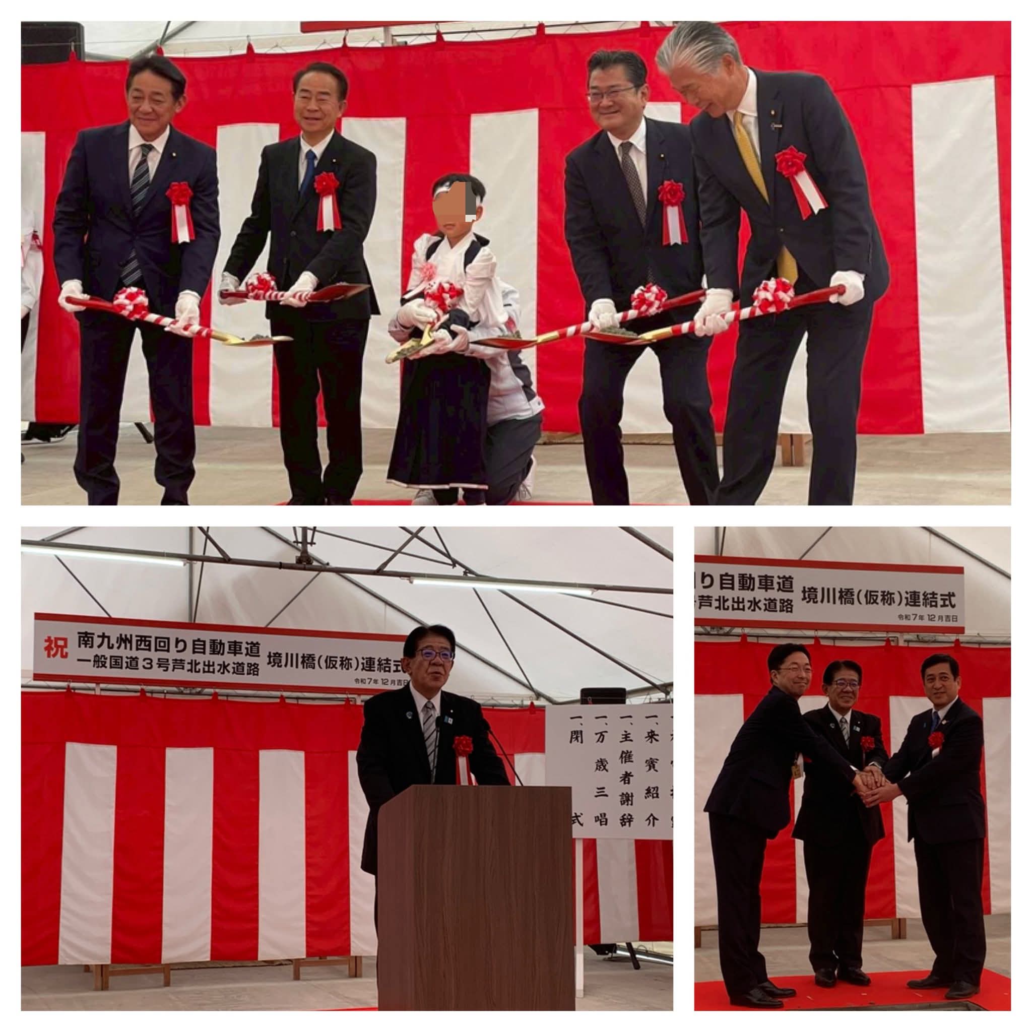 太宰府市議選告示 南九州西回り自動車道・芦北出水道路 境川橋連結式典 2025年12月7日 朝、久留米市を出発し、西鉄電車で太宰府市に移動。『おばた真由美』候補の出陣式に参加。『おばた真由美』候補への応援をお願いしました。 その後、車両にて熊本県水俣市と鹿児島県出水市の境まで移動。両県と両市をつなぐ橋梁の式典に出席。ご挨拶申し上げました。全線開通まで頑張ります! 終了後、新水俣駅から新幹線で福岡空港を目指しています。今日は九州を南北に移動が激しい1日です。 コメントは受け付けていません。
