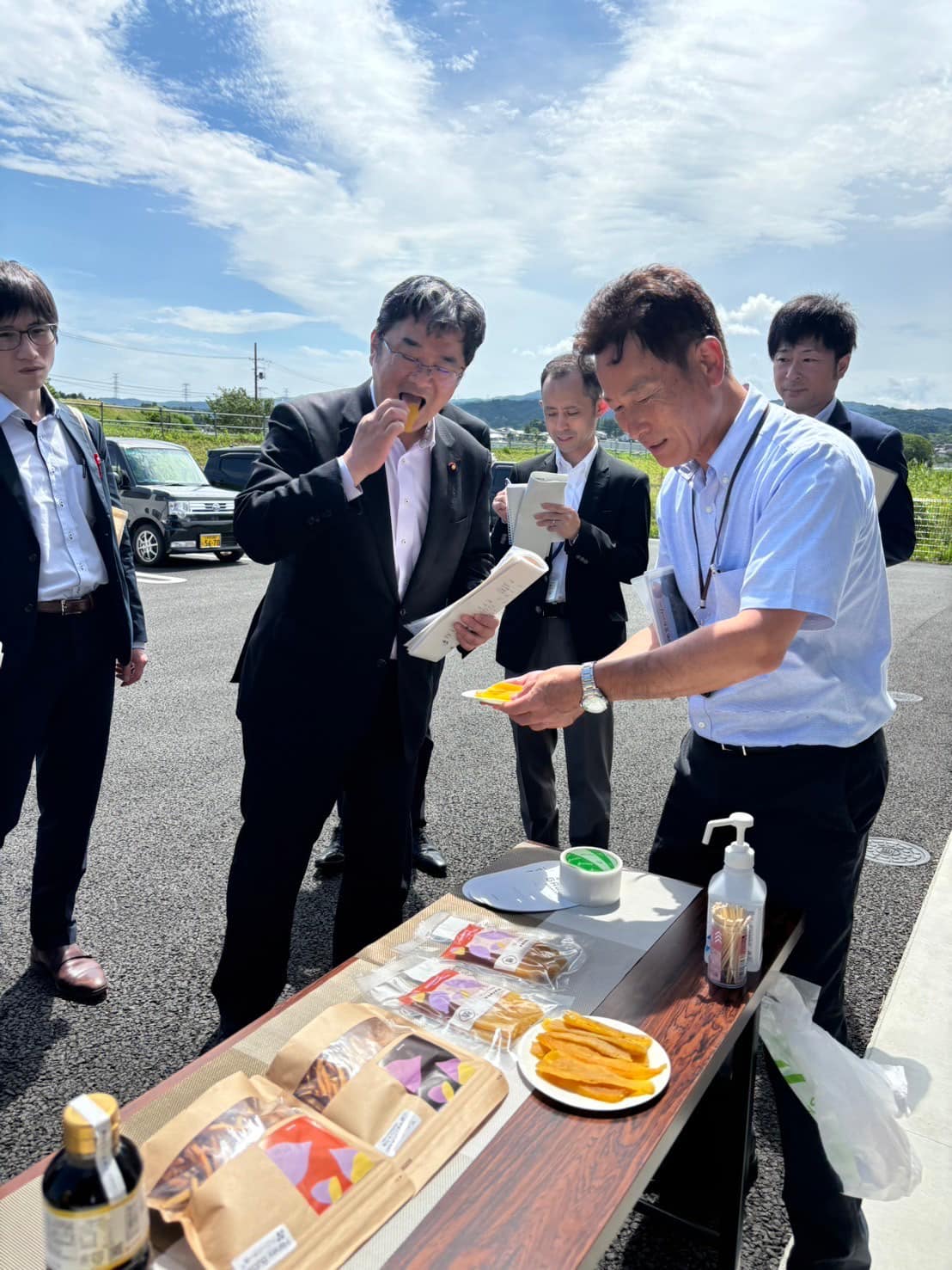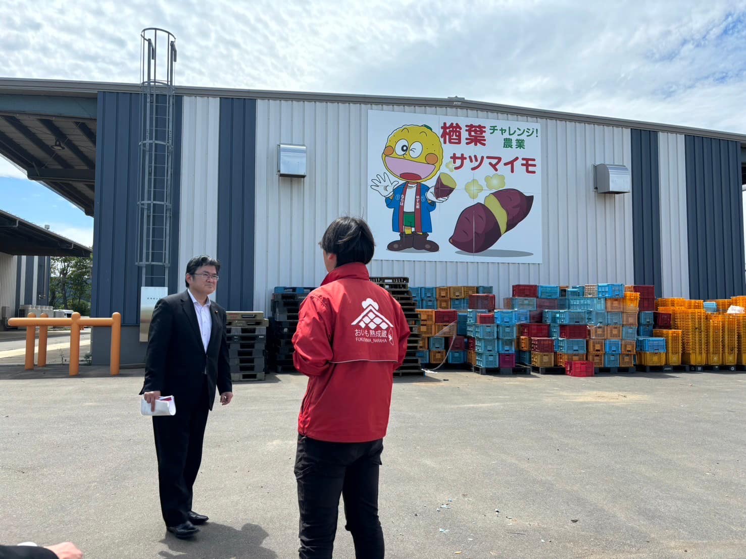 その後、楢葉町で松本町長とランチミーティングで意見交換。そのまま同町のしろはとファームを視察。さつまいも生産に力を入れる同町で収穫されたものは同社で全量買取され、宮崎の都城まで輸送され、加工後、広く全国の皆様に食されています。お隣の特産品開発センターで新商品のご紹介を受けるなど、楢葉町発の産業展開に多くを学びました。